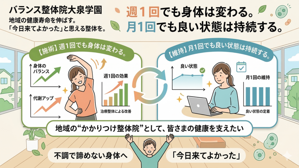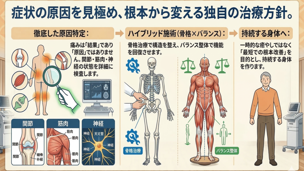 骨格を整える「骨格治療」× 軸を整える「バランス整体」を組み合わせ、持続する身体を作ります。