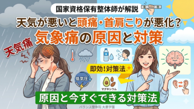 気圧や寒暖差による頭痛・首肩こり、気象病(天気痛)にお悩みの方必見!この記事では、国家資格を持つ整体師が、気象痛の原因と5つのセルフケア対策をわかりやすく解説します。気圧変化による不調を改善したい方はぜひご覧ください。