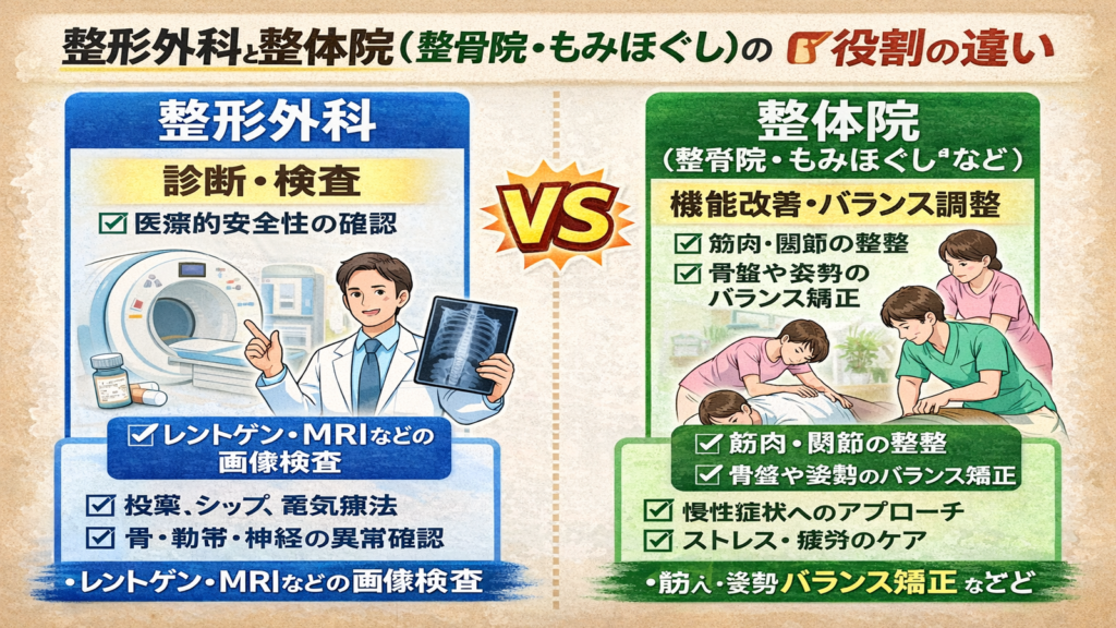 まずは整形外科で安全確認を行い、その上で改善が不十分な場合は、整体院や整骨院・マッサージ屋さんを活用する。この流れが、身体を守るための賢い選択といえるでしょう。