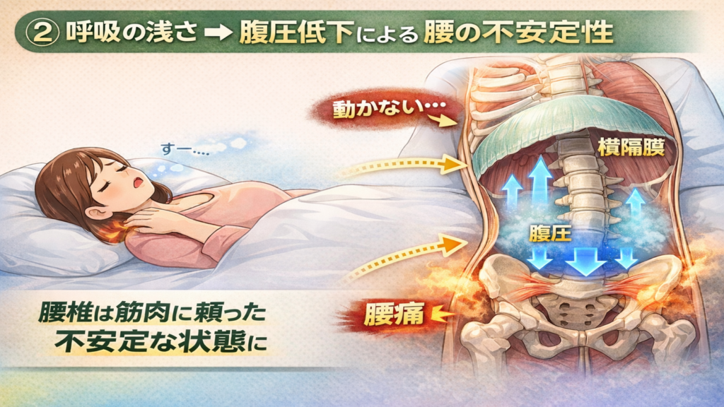 睡眠中の呼吸が浅いと、腰を支える腹圧(お腹の内側の支え)がうまく働きません。