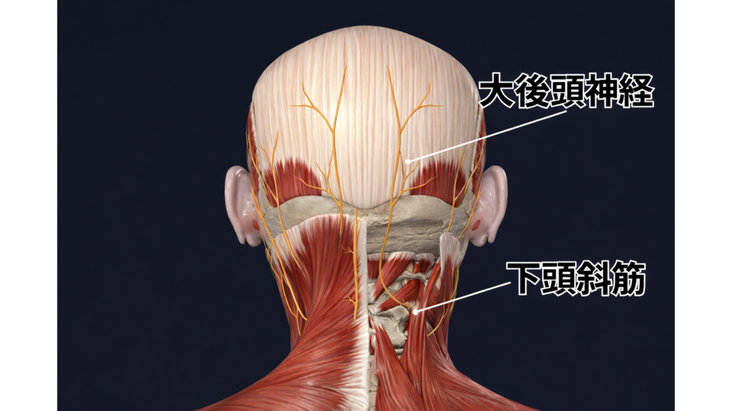 大後頭神経が通るエリアで、頸椎のバランスが崩れ、神経の通りが悪くなり刺激を受けやすくなります。