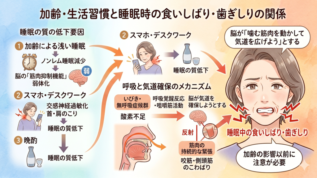 スマホの視すぎや、加齢により睡眠が浅くなる(早く起きてしまうようになる)と、深いノンレム睡眠が減り、脳の「筋肉を休ませる抑制機能」が弱くなり、睡眠中に歯ぎしりが起きやすくなります。