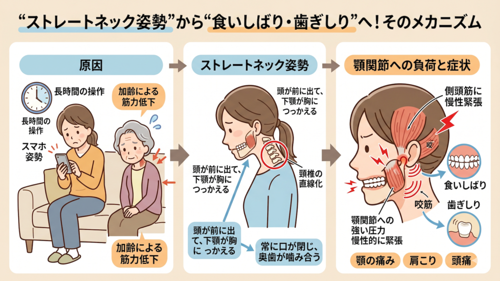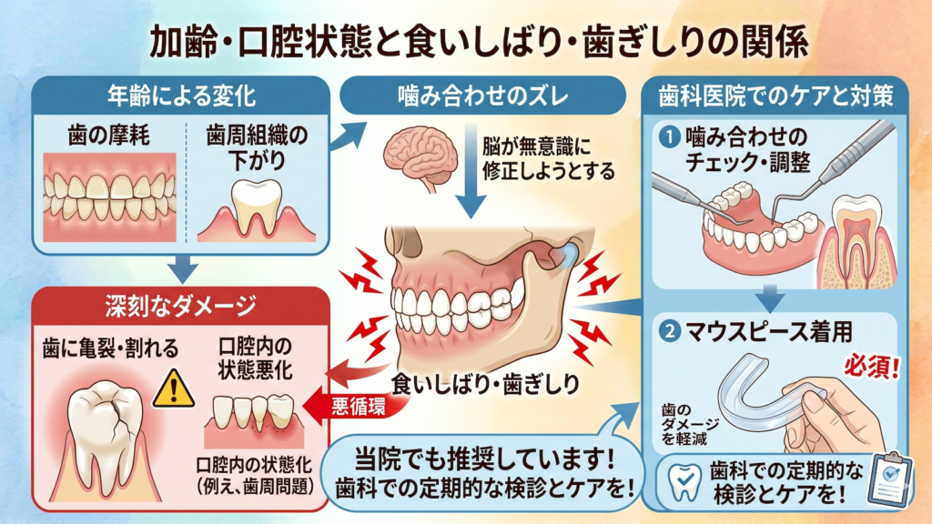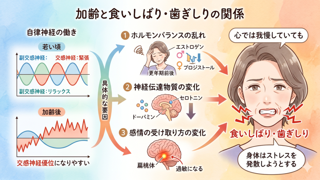 年齢とともに増える食いしばりには、単なるストレスだけでなく、身体の生理的な変化や姿勢の影響が深く関わっています。