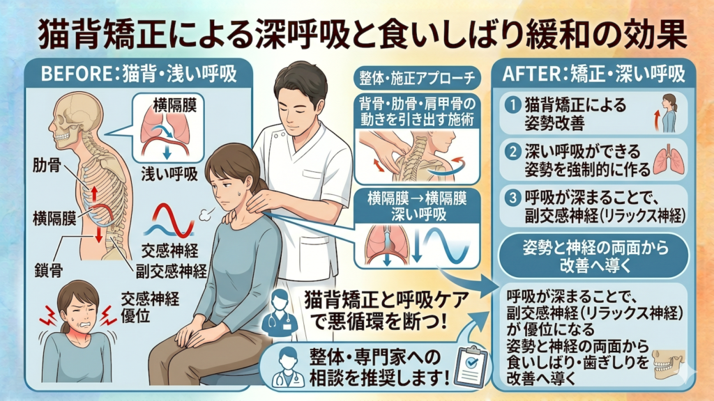 呼吸が深まることで、副交感神経(リラックス神経)が優位になり、姿勢と神経の両面から食いしばり・歯ぎしりを改善へ導くことができます。