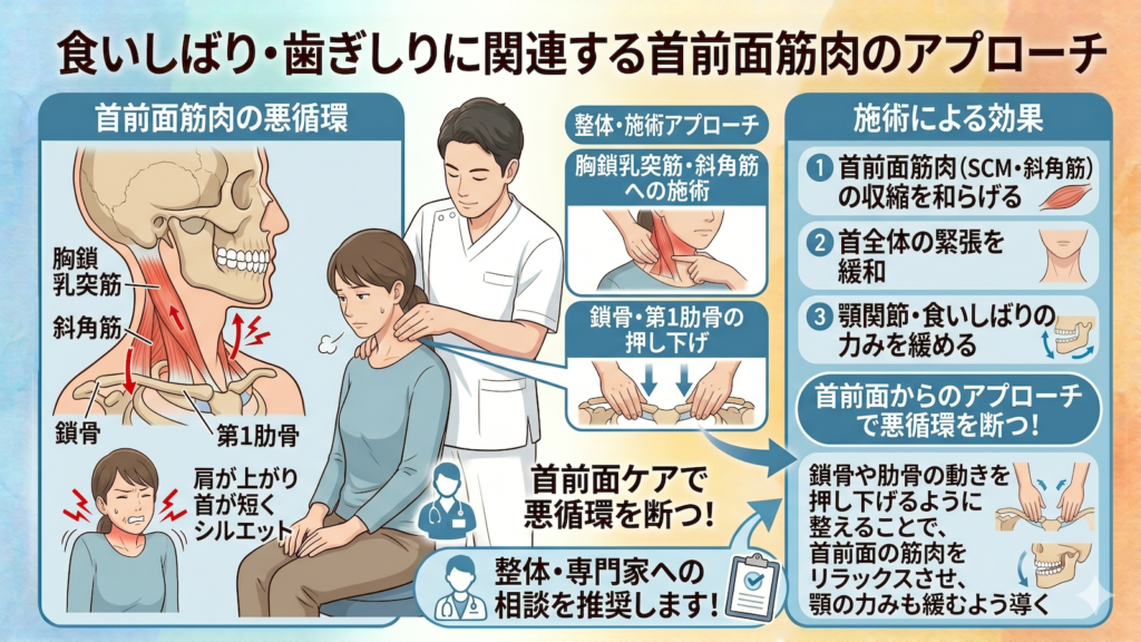 その他には、食いしばり・歯ぎしり時に働く胸鎖乳突筋や斜角筋(首の前面の筋肉)を中心にアプローチします。