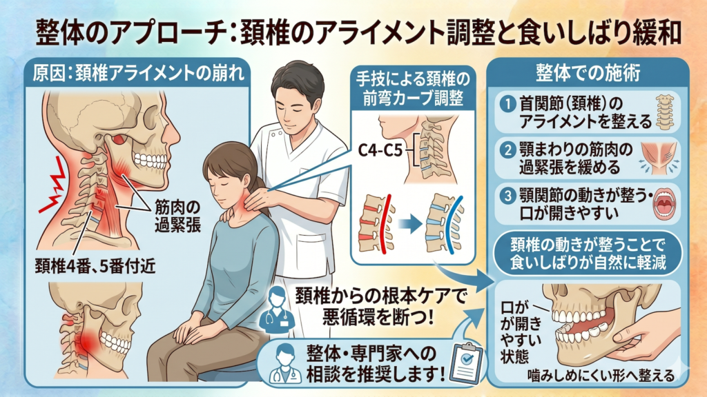 実際、頚椎の動きが整うことで食いしばりが自然に軽減する方は多く見られます。