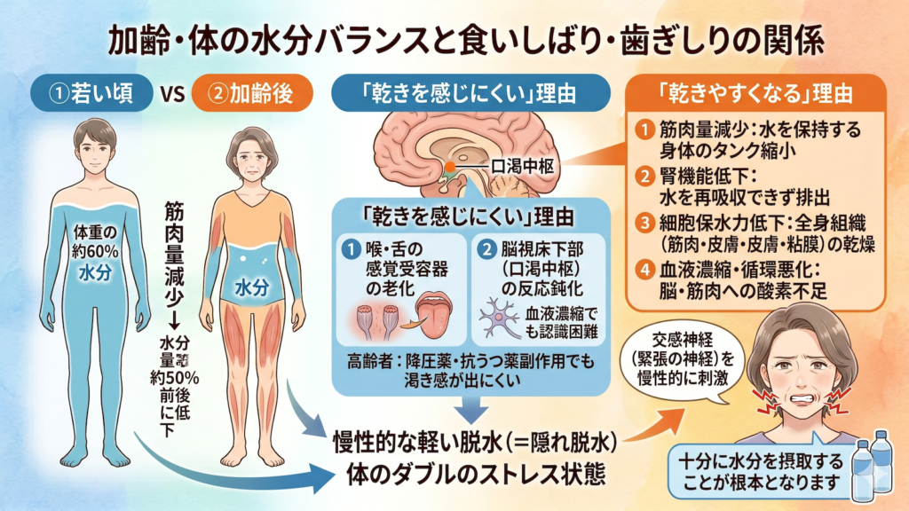 結果として、体は加齢とともに「水分不足+血流不足」というダブルのストレス状態に陥り、それが交感神経(緊張の神経)を慢性的に刺激し、食いしばり・歯ぎしりを誘発させてしまいます。